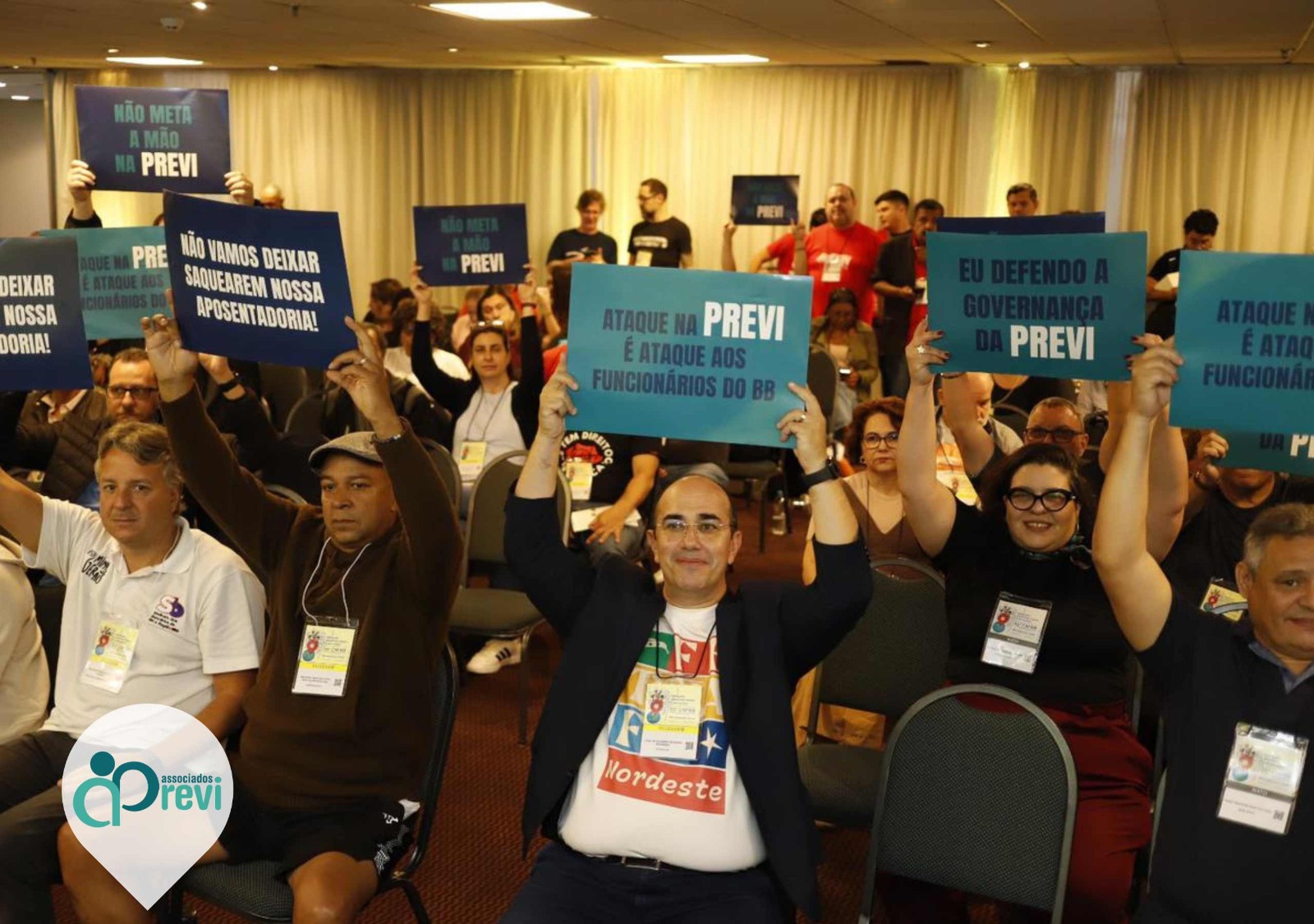 Dentro do 35º Congresso foi instalada uma mesa específica para debater a governança da Previ, que teve a participação do presidente João Fukunaga e dos diretores eleitos Márcio de Souza (Administração), Paula Goto (Planejamento) e Wagner Nascimento (Seguridade). Na abertura, dirigentes e associados da Previ fizeram um ato simbólico levantando cartazes em defesa da entidade (foto).