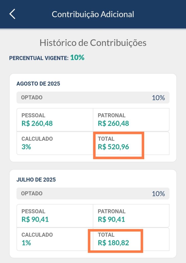 Veja como a reserva de poupança vai aumentar nesse exemplo abaixo de um associado que decidiu aumentar a contribuição para 10%.